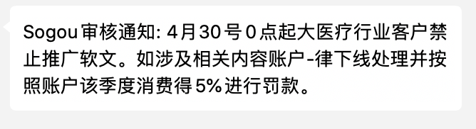 Sogou審核通知:4月30号0點起(qǐ)大醫療行業客戶禁止推廣軟文。如涉及相關内容賬戶-律下線處理并按照賬戶該季度消費得5%進(jìn)行罰款。