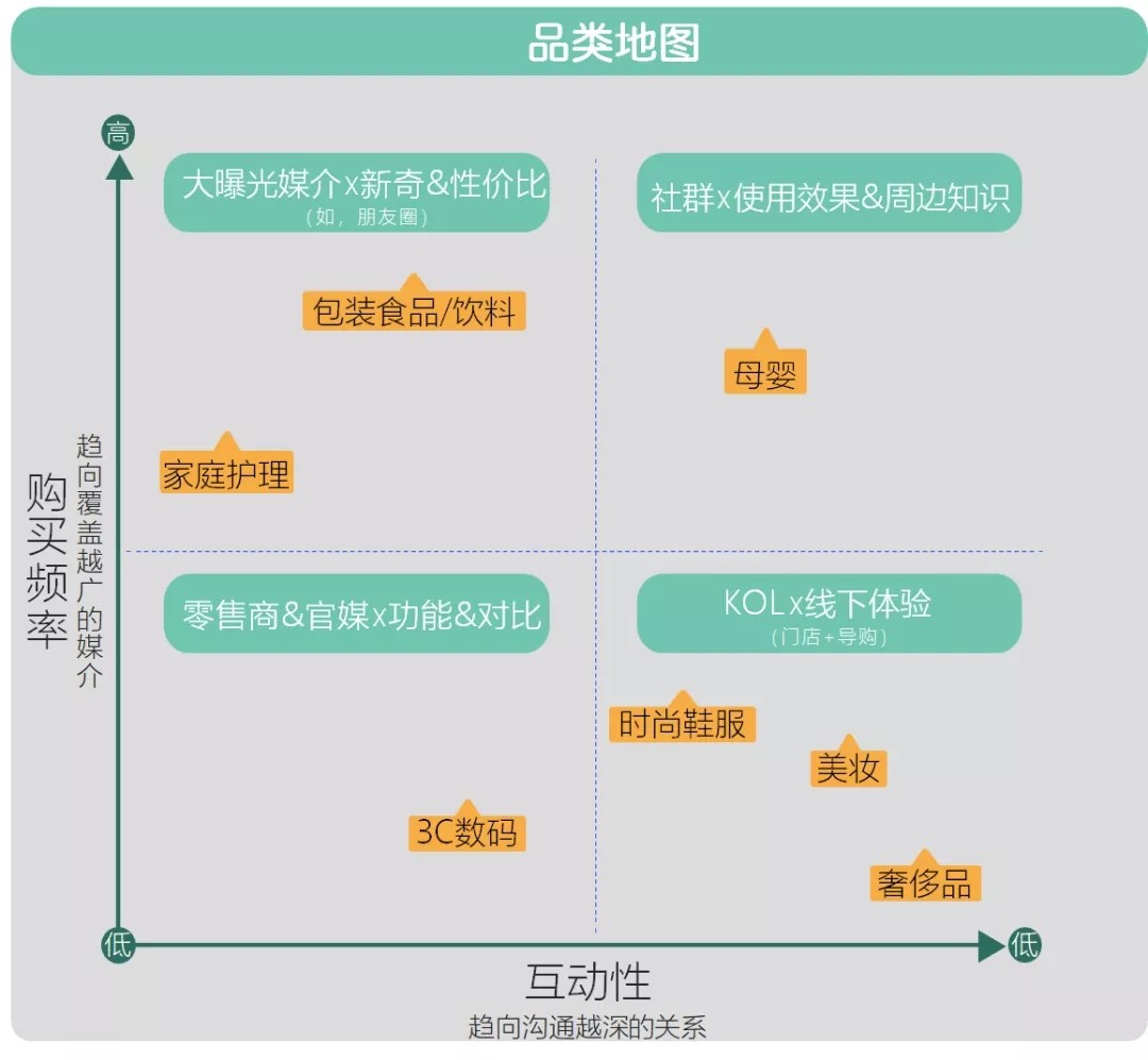 在這(zhè)張品類地圖中,橫坐标表示互動性,互動性越高,企業與消費者之間的溝通程度就越深。縱坐标表示購買頻率,購買頻率越高的産品,進(jìn)行廣告宣傳時就要選擇覆蓋面(miàn)廣的宣傳媒體。
