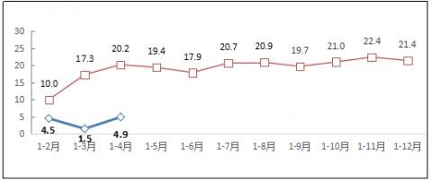 行業利潤扭轉下滑局面(miàn)。1-4月,全行業共實現營業利潤327.3億元,同比增長(cháng)4.8%,扭轉1-3月下滑(-24.9%)局面(miàn),仍低于去年同期29.1個百分點。