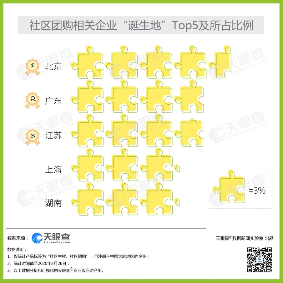 36氪獲悉,天眼查專業版數據顯示,據不完全統計,目前我國(guó)大陸地區有近200家涉及社區團購、社區生鮮相關業務的企業。從地域分布來看,北京市的相關企業數量最多,占相關企業總量的14%,廣東省和江蘇省次之,均擁有超過(guò)20家相關企業,上海市和湖南省并列位居第四位。五個省市地區的相關企業數量之和占全國(guó)的55%。