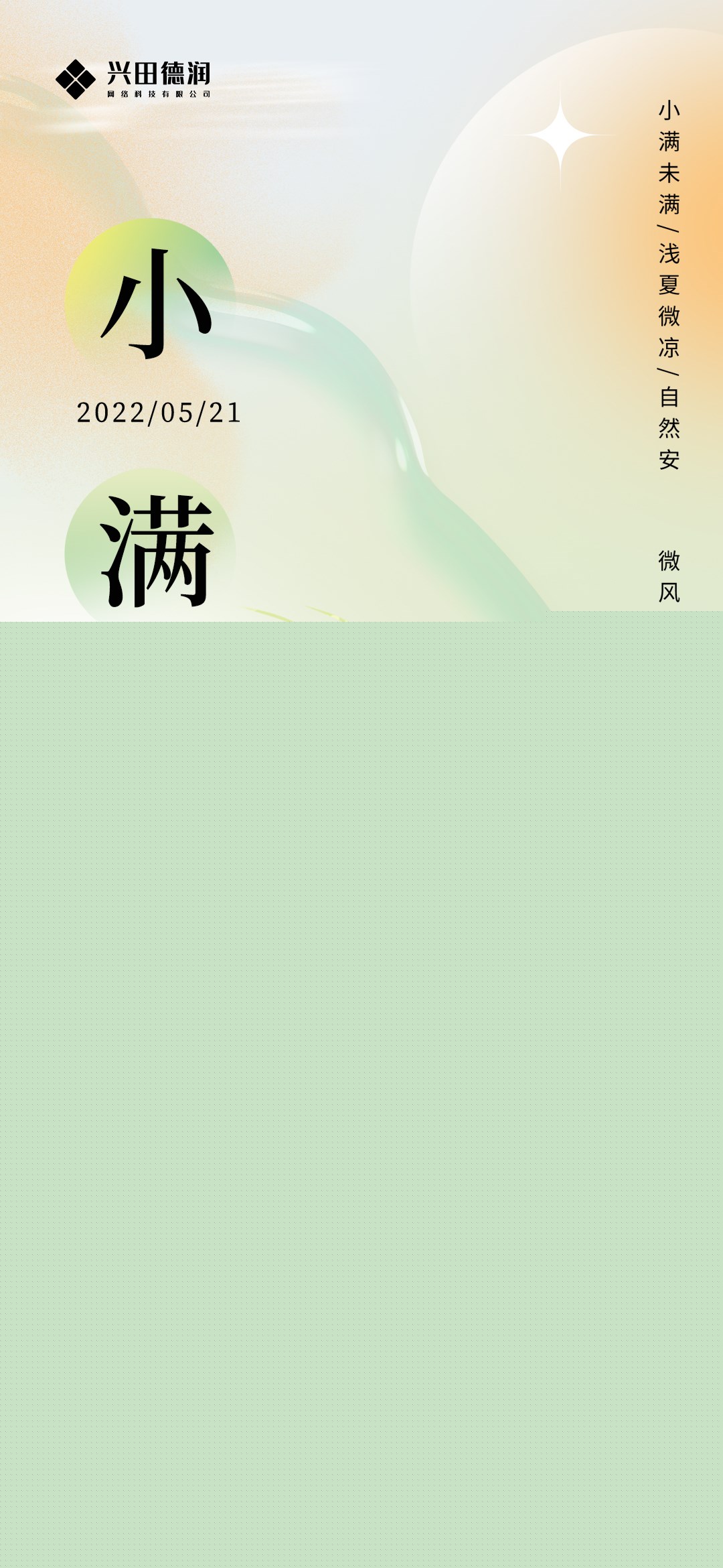 小滿,“二十四節氣”之一,是夏季的第二個節氣。小滿節氣的氣候特點是降水頻繁,往往會出現持續大範圍的強降水。小滿節氣後(hòu)南方雨水漸盛,正如民諺雲“小滿,江河漸滿”,小滿反映雨水豐盈。另有解釋是指北方麥類等夏熟作物的籽粒開(kāi)始灌漿,隻是剛開(kāi)始飽滿,還(hái)未完全飽滿。