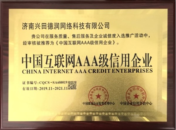 近日,興田科技憑借在互聯網領域深耕七年的技術經(jīng)驗優勢、優質的服務水平和完善的售後(hòu)體系,在合作客戶中享有極高的企業信譽度和美譽度,被(bèi)中國(guó)質量認證監督管理中心、中國(guó)企業信用評估中心評選爲中國(guó)互聯網AAA級信用企業。