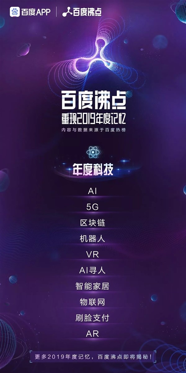 今天,百度率先發(fā)布“百度沸點2019年度科技熱詞”——AI、5G、區塊鏈、機器人、VR、AI尋人、智能(néng)家居、物聯網、刷臉支付、AR十個關鍵詞成(chéng)爲2019年最受中國(guó)網民關注的科技領域熱詞。